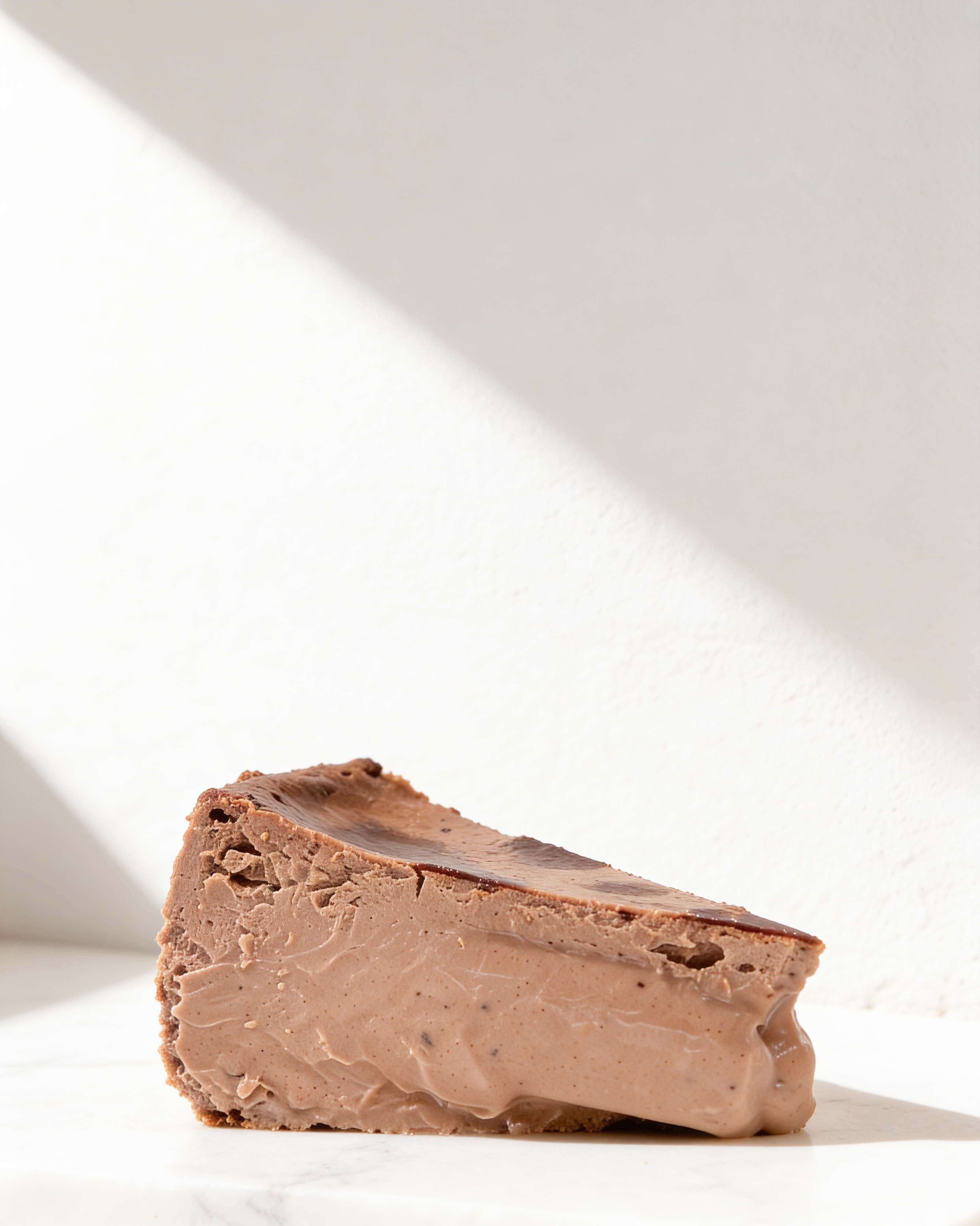 Esta tarta está elaborada siguiendo nuestra técnica de "doble emulsión". Incorporamos una crema de Chocolate Belga de alta gama a nuestra base de tarta de queso. Al usar chocolate fundido, conseguimos una textura densa pero increíblemente fundente.